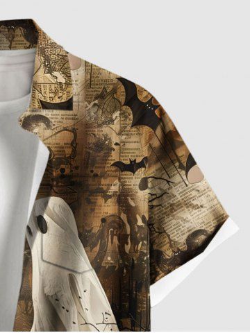 Plus Size Skull Pumpkin Spider Web Cat Ghost Bat Distressed Newspaper Print Halloween Shirt For Men - Brown - L