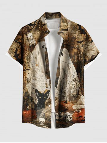 Plus Size Skull Pumpkin Spider Web Cat Ghost Bat Distressed Newspaper Print Halloween Shirt For Men - Brown - 3xl