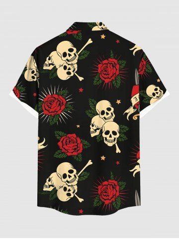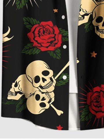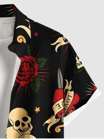 Plus Size Skull Rose Flower Heart Print Halloween Button Pocket Shirt For Men - Black - Xl