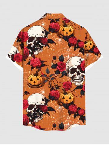 Plus Size Skull Rose Flower Leaf Pumpkin Print Halloween Button Pocket Shirt For Men - Orange - 3xl