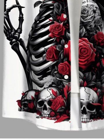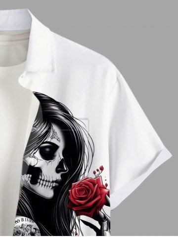 Plus Size Skull Skeleton Lovers Rose Flower Print Halloween Button Pocket Shirt For Men - White - L