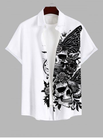Plus Size Skulls Floral Butterfly Two Tone Print Halloween Button Pocket Shirt For Men - White - Xl