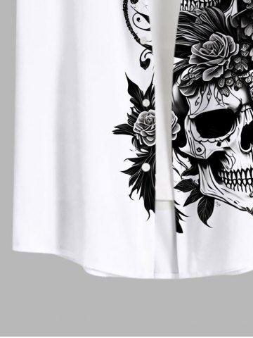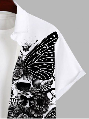 Plus Size Skulls Floral Butterfly Two Tone Print Halloween Button Pocket Shirt For Men - White - 2xl