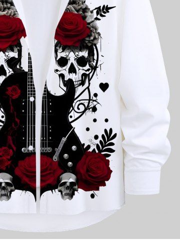 Plus Size Skulls Flower Leaf Heart Guitar Ink Painting Print Halloween Button Shirt For Men - White - 4xl