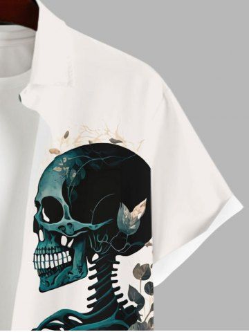 Plus Size Skulls Skeleton Lovers Distressed Flower Leaf Print Halloween Button Pocket Shirt For Men - White - M