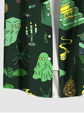 Plus Size Spider Pumpkin Ghost Bat Candle Print Halloween Button Pocket Shirt For Men - Green - S