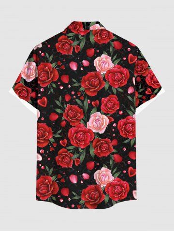 Plus Size Valentine's Day Rose Flowers Heart Print Buttons Pocket Shirt For Men - Red - M
