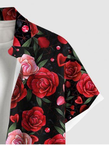 Plus Size Valentine's Day Rose Flowers Heart Print Buttons Pocket Shirt For Men - Red - 3xl