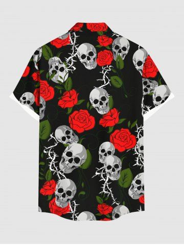 Plus Size Valentine's Day Rose Flowers Skulls Print Buttons Pocket Shirt For Men - Black - 4xl