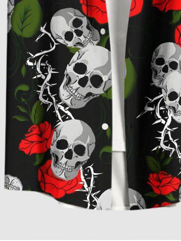 Plus Size Valentine's Day Rose Flowers Skulls Print Buttons Pocket Shirt For Men - Black - 5xl