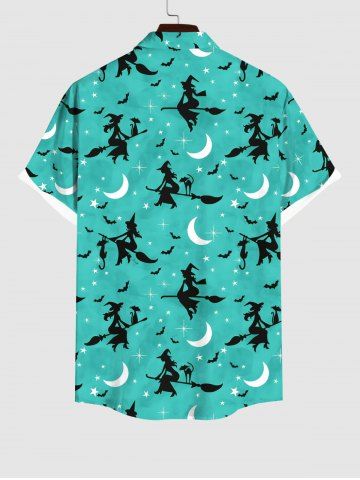 Plus Size Wizard Broom Bat Cat Moon Star Galaxy Print Halloween Button Shirt For Men - Green - M