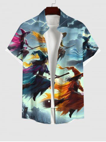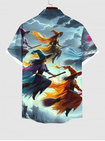 Plus Size Wizard Broom Ombre Sky Cloud Print Halloween Button Pocket Shirt For Men - Multi-a - 3xl