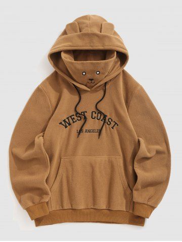 Men's WEST COAST LOS ANGELES Letter Embroidered Fuzzy Polar Fleece Kangaroo Pocket Pullover Mask Hoodie - Coffee - S