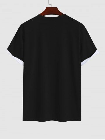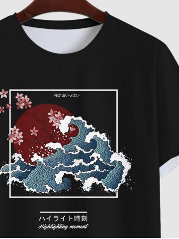 Men's Flowers Sun Sea Waves Japanese Characters Print T-shirt - Black - 8xl