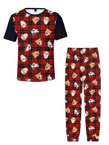 Plus Size Men's Christmas Plaid Dog Print T-shirt - Red - 2xl