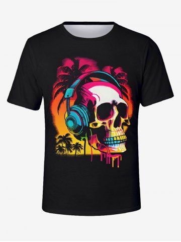 Plus Size Coconut Tree Ombre Dusk Skull Earphone Print Hawaii Music Festival T-shirt For Men - Black - 4xl