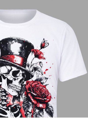 Plus Size Skull Skeleton Hat Rose Flower Leaf Print Valentines T-shirt For Men - White - S