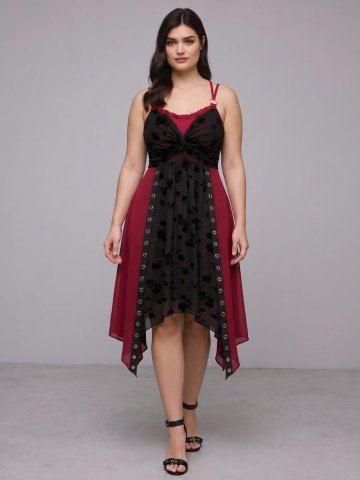 Midi Dresses > Gothic Plus Size Flower Flocking Twist Lace Up Crisscross Strappy Handkerchief Dress