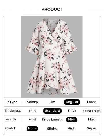 Midi Dresses > Plus Size Vacation Flower Print Tied Side Surplice Flounce Asymmetrical Hem Midi Wrap Dress