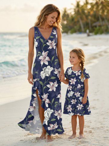 Mommy and Me > Flower Leaf Branch Print Matching Hawaii Beach Mommy & Me Outfit