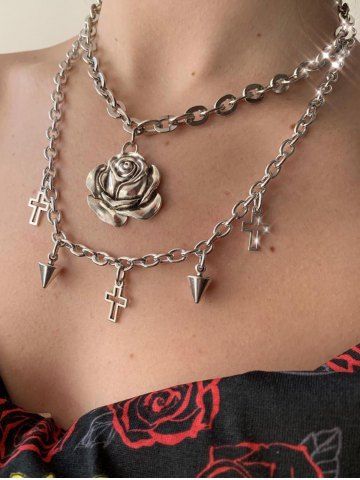 Rose Cross Pendant Layered Necklace - Silver