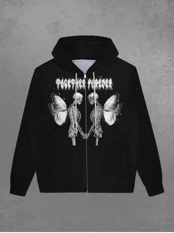 Gothic 3D Skeleton Butterfly Print Zipper Pockets Drawstring Halloween Hoodie For Men - Black - 3xl