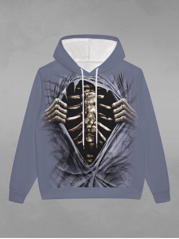 Gothic 3D Skeleton Ripped Print Halloween Pocket Drawstring Hoodie For Men - Gray - Xs