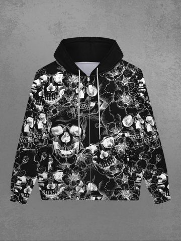Gothic 3D Skull Rose Flower Mesh Print Zipper Pocket Drawstring Hoodie For Men - Black - Xl