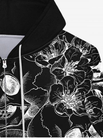 Gothic 3D Skull Rose Flower Mesh Print Zipper Pocket Drawstring Hoodie For Men - Black - 4xl