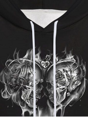 Gothic 3D Skulls Fire Flame Heart Print Pocket Drawstring Fleece Lining Halloween Pullover Hoodie For Men - Black - L