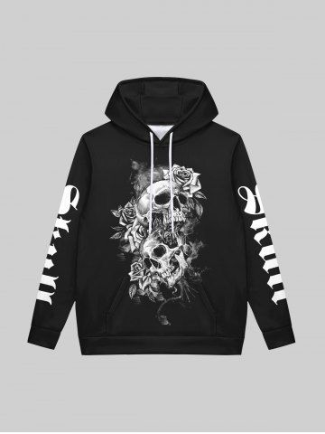 Gothic 3D Skulls Rose Flower Letters Print Pocket Drawstring Fleece Lining Pullover Hoodie For Men - Black - L