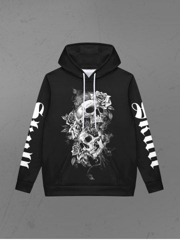Gothic 3D Skulls Rose Flower Letters Print Pocket Drawstring Fleece Lining Pullover Hoodie For Men - Black - 5xl