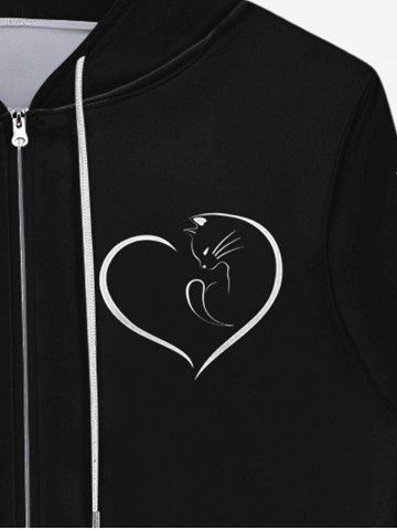 Gothic Cat Heart Print Valentines Pocket Zipper Drawstring Fleece Lining Hoodie For Men - Black - 7xl