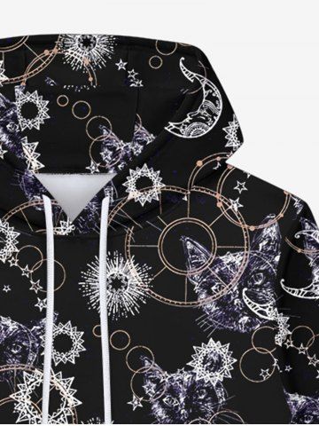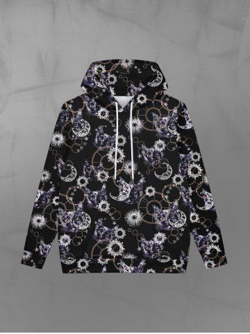 Gothic Cat Sun Moon Print Fleece Lining Pocket Drawstring Pullover Hoodie For Men - Black - Xl