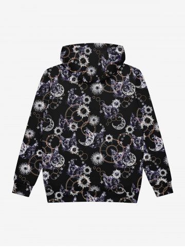 Gothic Cat Sun Moon Print Fleece Lining Pocket Drawstring Pullover Hoodie For Men - Black - 2xl