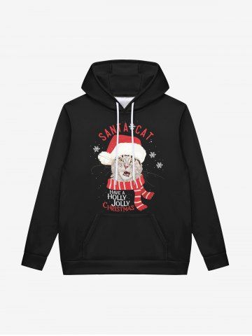 Gothic Christmas Hat Cat Letters Snowflake Print Fleece Lining Drawstring Hoodie For Men - Black - 2xl