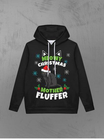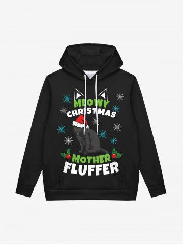 Gothic Christmas Hat Cat Snowflake Print Fleece Lining Drawstring Hoodie For Men - Black - 3xl