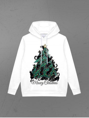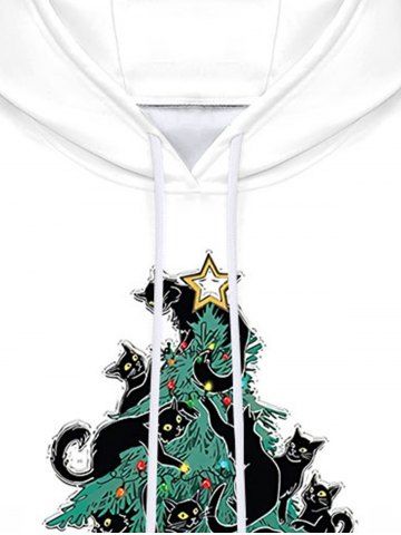 Gothic Christmas Tree Cats Star Light Print Pockets Fleece Lining Drawstring Hoodie For Men - White - L