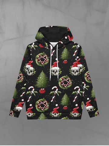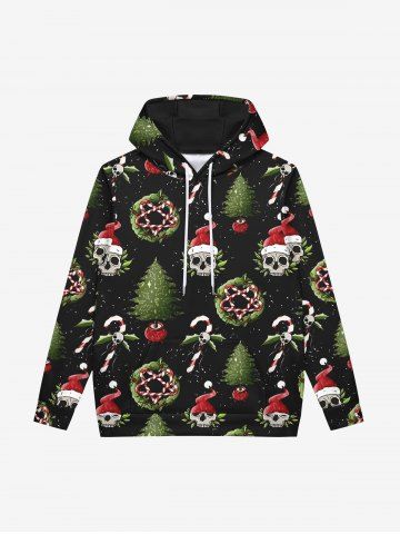 Gothic Christmas Tree Hat Skulls Wreath Candy Print Fleece Lining Drawstring Hoodie For Men - Black - 3xl