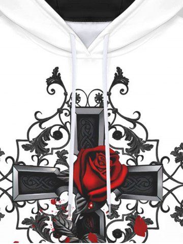 Gothic Cross Rose Flower Leaf Print Pockets Fleece Lining Drawstring Hoodie For Men - White - L
