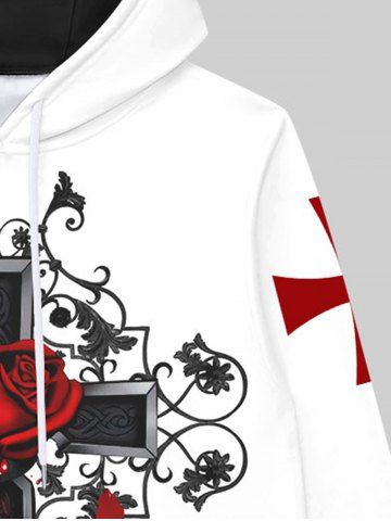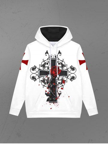 Gothic Cross Rose Flower Leaf Print Pockets Fleece Lining Drawstring Hoodie For Men - White - Xl