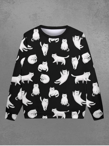 Gothic Cute White Cats Print Crew Neck Sweatshirt For Men - Black - 3xl
