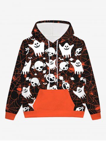 Gothic Halloween Skull Ghost Candy Spider Web Print Drawstring Hoodie For Men - Red - L