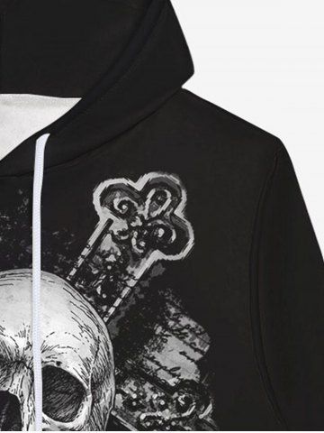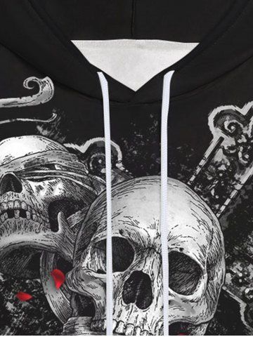 Gothic Halloween Skulls Rose Cross Print Fleece Lined Drawstring Hoodie For Men - Black - 4xl