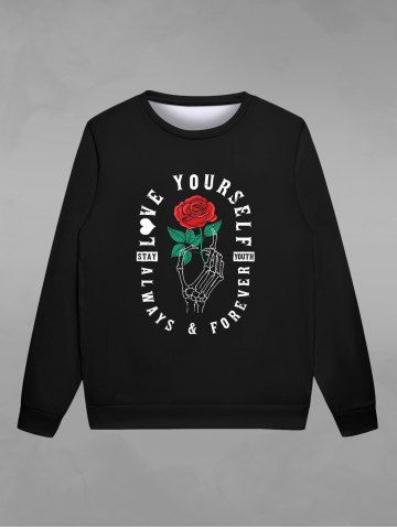 Gothic Rose Flower Leaf Skeleton Hand Letters Print Valentines Pullover Sweatshirt For Men - Black - 3xl