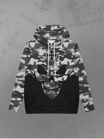 Gothic Skull Camouflage Print Fleece Lining Pocket Drawstring Hoodie For Men - Black - M
