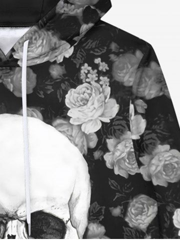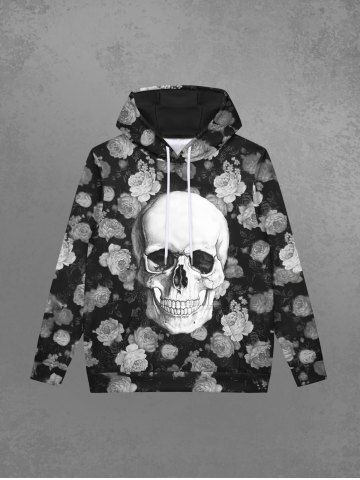 Gothic Skull Rose Flower Print Fleece Lining Drawstring Hoodie For Men - Black - M