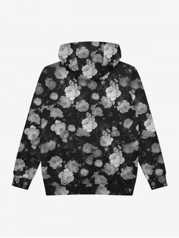 Gothic Skull Rose Flower Print Fleece Lining Drawstring Hoodie For Men - Black - L