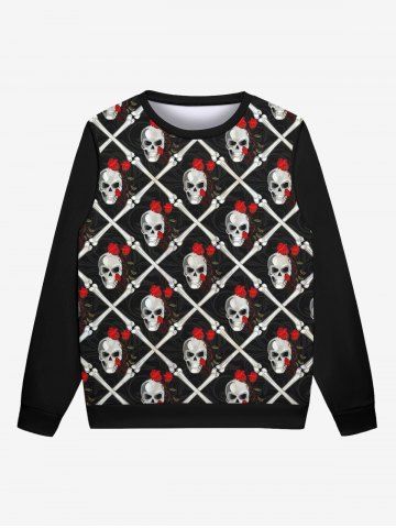 Gothic Skulls Bone Plaid Rose Flower Print Pullover Long Sleeves Sweatshirt For Men - Black - 2xl