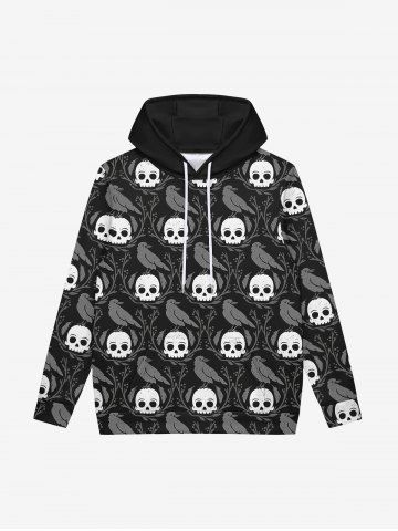 Gothic Skulls Branch Birds Print Pockets Fleece Lining Drawstring Hoodie For Men - Black - 2xl